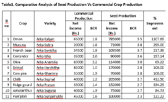 Economic analysis revealed that seed production offered substantially higher returns, with an average Benefit–Cost (BC) ratio of 3.05, compared to 1.77 for commercial crop cultivation. Among various crops, onion seed production recorded the highest BC ratio (4.5), followed by ridge gourd, bottle gourd, chilli, and French bean.