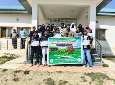 कृषि विज्ञान केन्द्र, बारामूला, भाकृअनुप-केन्द्रीय समशीतोष्ण बागवानी अनुसंधान संस्थान, ने आर्या (कृषि में युवाओं को आकर्षित करना तथा उन्हें जोड़े रखने) के मुहिम के तहत 24-28 फरवरी, 2026 तक केवीके में “स्मार्ट नर्सरी प्रक्रिया: कम लागत वाले पॉलीहाउस के तहत प्रवर्धन से डिजाइनर पौध उत्पादन तक’” पर पांच दिन का प्रशिक्षण कार्यक्रम सफलतापूर्वक आयोजित किया। यह कार्यक्रम ग्रामीण युवाओं में तकनीकी क्षमता बनाने तथा वैज्ञानिक नर्सरी उगाने और पौध प्रदर्शन में उद्यमिता के मौकों को बढ़ावा देने के लिए डिज़ाइन किया गया था।