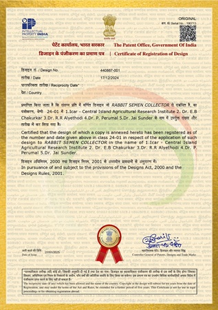 Semen collection and artificial insemination (AI) are essential tools in modern rabbit farming and research, significantly contributing to genetic improvement, disease prevention, and overall reproductive efficiency. Recognizing the need for a simple and cost-effective solution, ICAR-Central Island Agricultural Research Institute, Sri Vijaypuram has been granted a design patent (No. 440867-001) for the “Rabbit Semen Collector.”