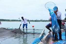 A novel three tier model comprising nursery rearing, pre-grow out and grow out cages were taken up in a phased manner. Asian seabass (Lates calcarifer) fish was chosen as culture species due to its growth potential, availability of seed and feed and higher market value. The farming cycle began with stocking of fish fry (1cm size) initially in the nursery cages, they were grown to fingerlings size in 45-60 days (7-8 cm size), transferred from nurseries to pre-grow-out cage and then 90-100g juveniles from pre-grow out were transferred to grow out cages for further rearing. The stocking density adopted was 12 kg per/m3. The fishes were fed with CIBA’s formulated indigenous feed (SeebassPlus @ Rs80/kg)) respectively @ 10-8%, 4-6% and 2-4% of their body weight in nursery, pre-grow-out and grow out stages. The average Feed Conversion Ratio (FCR) realised was 1.85:1(1.85 kg feed to produce 1 kg fish). The juveniles were grown to a marketable size of 900 g - 1.25 kg in 6 months. A productivity of 460 kg was realised in two partial harvests in one cycle. Two cycles of production can be taken in a year. The production cost was worked out to be Rs.190 per kg of fish and sale price was Rs.380 per kg with a B: C ratio of 2.0. The fish producers were linked to Tamil Nadu Fisheries Development Corporation a state government body which procures fishes from producers giving farm gate price and sale to the consumers through its outlets.