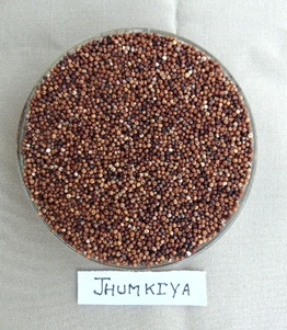 यह प्रजाति, श्री भूपेन्द्र जोशी, ग्राम गली बस्यूरा, जनपद अल्मोड़ा द्वारा गैर सरकारी संस्था लोक चेतना मंच, रानीखेत के माध्यम से प्रस्तुत की गई थी। झुमकिया मंडुवा की औसत परिपक्वता अवधि लगभग 115 दिन है। इस किस्म को मध्यम उर्वरता वाली वर्षा आधारित भूमि में, विशेष रूप से उत्तराखण्ड की पर्वतीय परिस्थितियों में बोया जाता है। झुमकिया मंडुवा के बीजों का रंग तांबे जैसा भूरा एवं सतह खुरदरी है। इसकी बालियों में शाखन, बहु-स्तरीय अंगुली व्यवस्था तथा अर्ध-सघन बनावट जैसी विशिष्टताएँ इसे अन्य तुलनीय किस्मों से स्पष्ट रूप से अलग हैं।
